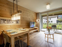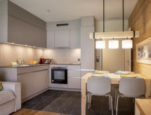 Accommodatie Nr.Aare, 2-room apartment 39 to 44 m2. Comfortable and modern furnishings: living/dining room with 1 double sofabed (160 cm, length 200 cm), dining table, international TV channels and flat screen. Exit to the balcony, to the terrace. 1 room with 1 double bed (2 x 90 cm, length 200 cm). Exit to the balcony, to the terrace. Open kitchen (oven, dishwasher, 4 ceramic glass hob hotplates, electric coffee machine, Capsules for coffee machine (Nespresso) extra). Shower/WC. Underfloor heating. Parquet floors. Balcony 10 m2, south-west facing position or terrace 12 m2, south-west facing position. Terrace furniture, balcony furniture. Partial view of the mountains. Facilities: hair dryer. Internet (WiFi, free). Please note: suitable for families. Non-smoking house. 1 pet/ dog allowed. The property is one of a type of property or apartment. A fondue set (meet or cheese) as well as a raclette grill can be borrowed at the reception against a deposit.