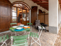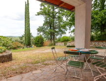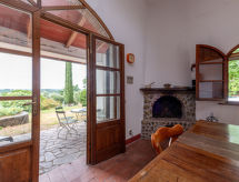 Accommodatie Nr.Pescine 2, 2-room semi-detached house 60 m2 on 2 levels. Cosy furnishings: living/dining room with open-hearth fireplace, dining table, TV, wood-burning stove and air conditioning. Exit to the terrace. 1 room with 1 double bed (200 cm). Open kitchen (oven, dishwasher, 6 gas rings, toaster, kettle, microwave). Exit to the terrace. Shower/bidet/WC. Upper floor: (spiral staircase) open gallery with sloping ceilings with 3 beds. Wood heating, forced-air heating. Heating not available in all rooms. Terrace roofed. Terrace furniture. Very beautiful panoramic view of the countryside. Facilities: washing machine, iron, baby cot for up to 2 year olds, hair dryer. Internet (WiFi, free). Parking. Please note: non-smokers only. 1 pet/ dog allowed. Private entrance. IT053007C2KFV6TISP