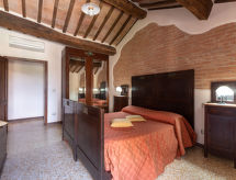 The organic and biodynamic farm Le Calle is located in the heart of the Montecucco DOC area and produces high quality wine, oil, pasta, cured meats, honey and legumes. In the structure animals of native breeds are bred such as the Cinta Senese pig, the Maremmana cow, Apennine sheep, Amiatino donkey and courtyard animals. The owners organize visits on an amusing agribus and once a week (June-August) a dinner is offered with the excellent products of the farm, which can also be purchased in the shop. Beautiful, cosy, rustic working farm Le Calle, surrounded by fields and vineyards. 3 apartments in the residence. 10 km from the centre of Cinigiano, in a sunny, elevated position, 50 km from the sea, in the countryside. For shared use: beautiful garden to relax, swimming pool (6 x 12 m, depth 120 - 170 cm, seasonal availability: 01.May. - 30.Oct.). Shower/WC in the pool area, volleyball, barbecue, children's playground, pool maintenance by the owner/gardener. In the house: reception, washing machine (for shared use). Parking on the premises. Grocery 1 km, supermarket 10 km, restaurant 3 km. Riding stable 10 km, walking paths from the house 20 m. Nearby attractions: Montalcino 35 km, Val d´Orcia, Monte Amiata, Castiglione della Pescaia 50 km. Hiking paths: Parco dell´Uccellina 50 km. Please note: car recommended. Local sale of farm products. Upon arrival you will find a free company product.